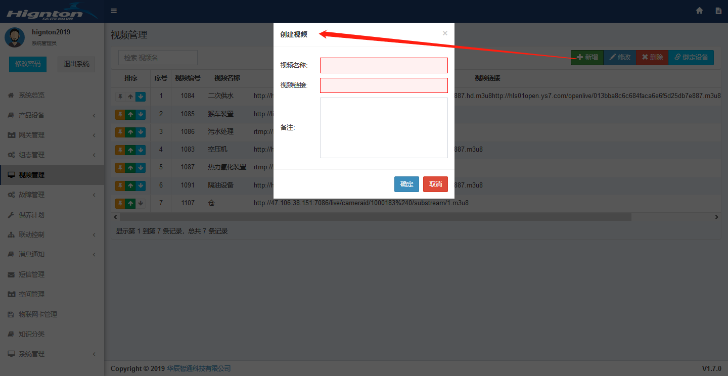 進入思普云,點擊【視頻管理】,點擊【新增】,視頻名稱自定義填寫,將螢石開放平臺上復制的鏈接粘貼到視頻鏈接,點擊確定,
