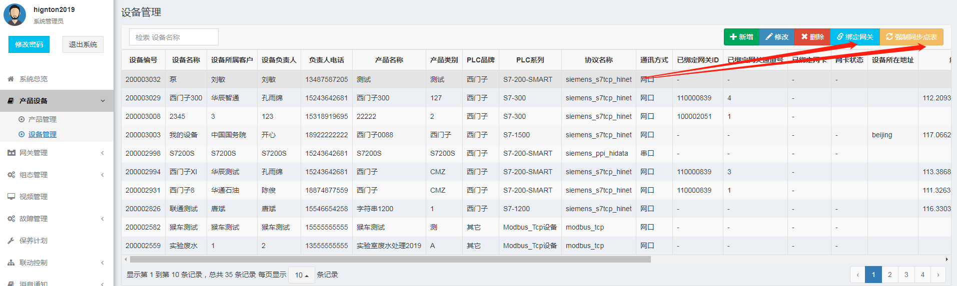 1. 點(diǎn)表中PLC的IP是否正確,以思普云平臺采集數(shù)據(jù)為例,思普云平臺的“產(chǎn)品設(shè)備”——“ 設(shè)備管理”處,選擇設(shè)備點(diǎn)擊【綁定網(wǎng)關(guān)】,設(shè)備IP填PLC的IP,再強(qiáng)制同步點(diǎn)表。