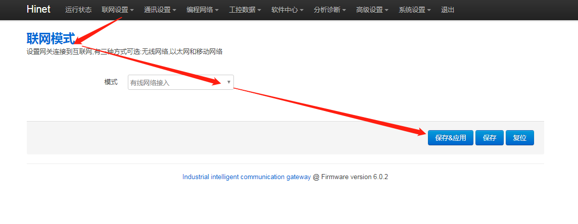 1. 網(wǎng)關(guān)后臺聯(lián)網(wǎng)模式是否正確,進網(wǎng)關(guān)后臺,點擊“聯(lián)網(wǎng)設(shè)置 - 聯(lián)網(wǎng)模式”,修改模式為“有線網(wǎng)絡(luò)接入”,再點擊【保存應(yīng)用】,重啟網(wǎng)關(guān)生效。