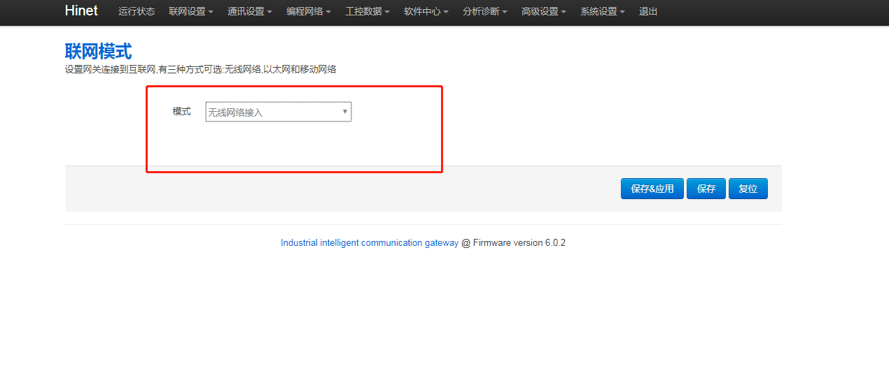 1. 網(wǎng)關(guān)后臺聯(lián)網(wǎng)模式是否正確,進(jìn)網(wǎng)關(guān)后臺,點擊“聯(lián)網(wǎng)設(shè)置 - 聯(lián)網(wǎng)模式”,修改模式為“無線網(wǎng)絡(luò)接入”,再點擊【保存應(yīng)用】,重啟網(wǎng)關(guān)生效。