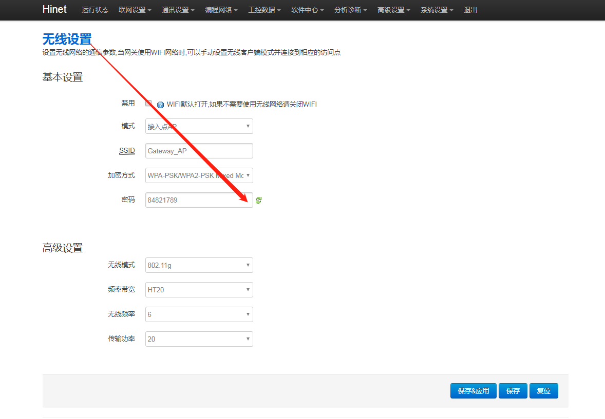2.WIFI密碼是否正確,進(jìn)網(wǎng)關(guān)后臺,點擊“通訊設(shè)置 - 無線設(shè)置”,點擊顯示密碼圖標(biāo),確認(rèn)密碼。
