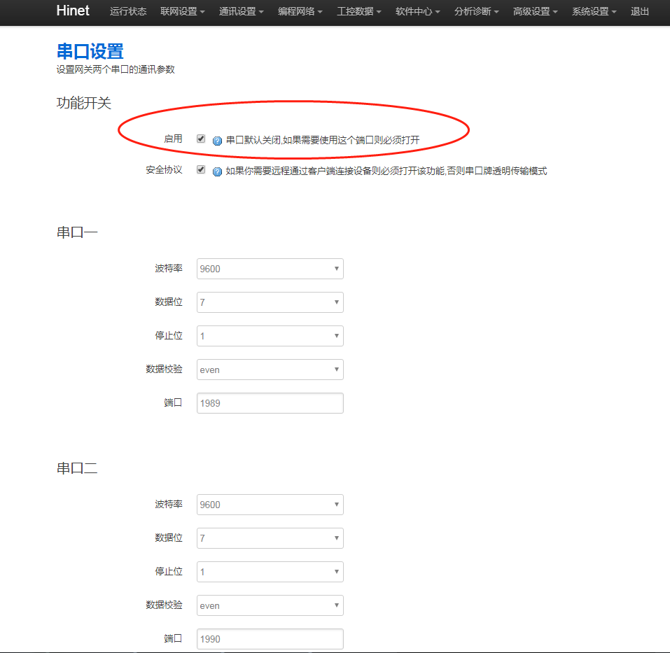 1. 網(wǎng)關(guān)串口功能是否開啟,進(jìn)網(wǎng)關(guān)后臺(tái),點(diǎn)擊“通訊設(shè)置 - 串口設(shè)置”,串口勾選【啟用】。